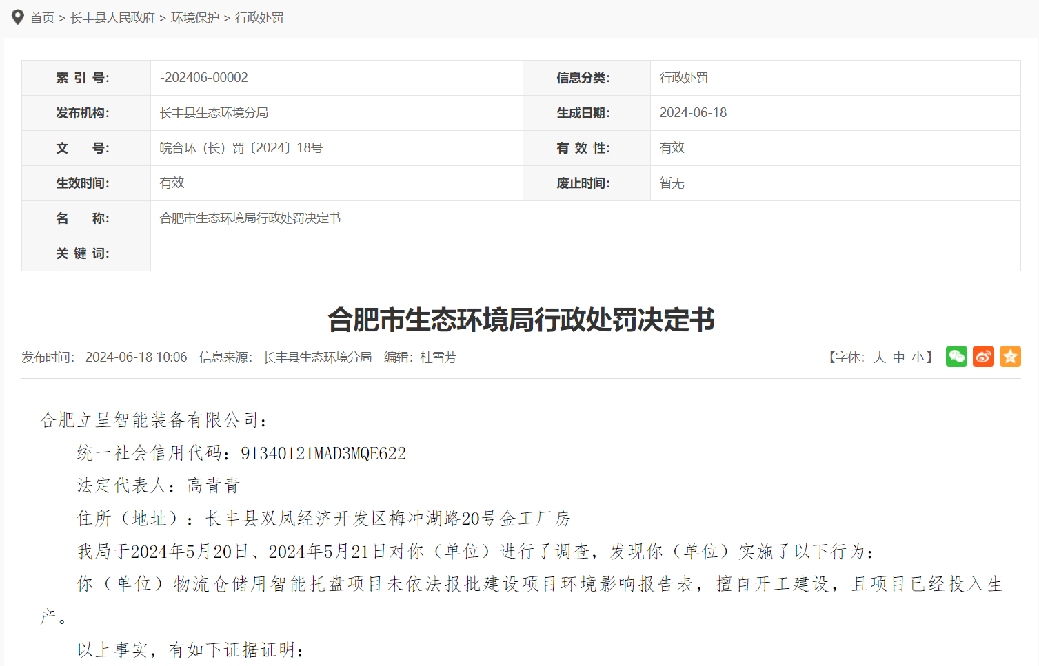 公开处罚信息显示,合肥市生态环境局于2024年5月20日、2024年5月21日对合肥立呈智能装备进行了调查,发现该公司物流仓储用智能托盘项目,未依法报批建设项目环境影响报告表,擅自开工建设,且项目已经投入生产。