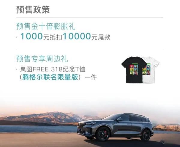 此外,岚图FREE 318纪念T恤领取说明:1、岚图FREE 318纪念T恤(腾格尔联名限量版)指导价1990积分,岚图车主、大定用户、FREE 318支付预售金用户限时折扣价318积分。2、用户将于预售金支付完成次日获得318积分。3、商品限时限星,请于2024年6月20日前,前往礼遇商城购买。