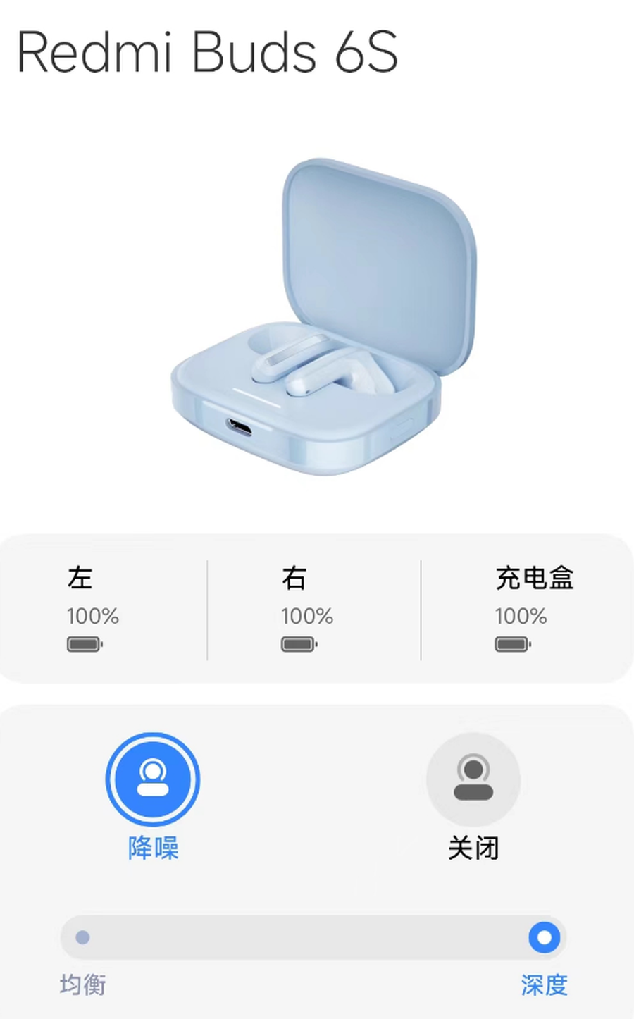 Redmi Buds 6S是市面上为数不多支持主动降噪的半入耳式耳机,提供均衡和深度两档,诸如办公室以及图书馆等低噪音环境,开启降噪后将会获得更加静谧的听感体验。