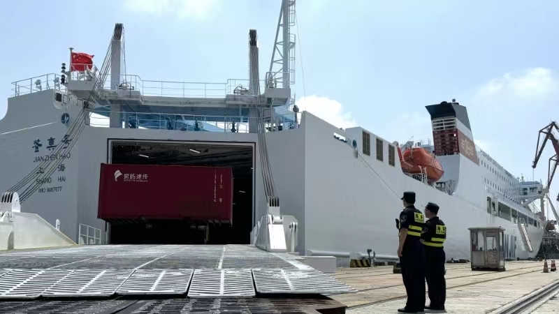 上海军工路码头,一批出口至日本的货物近日在上海海关所属上海吴淞海关监管下,装上第三代“鉴真号”客滚船。16时45分,“鉴真号”客滚船承载107个标箱开船,驶往日本神户。这是6月8日“鉴真号”轮从上海出发,驶向日本大阪,开启首航之旅后,首次载货东渡。