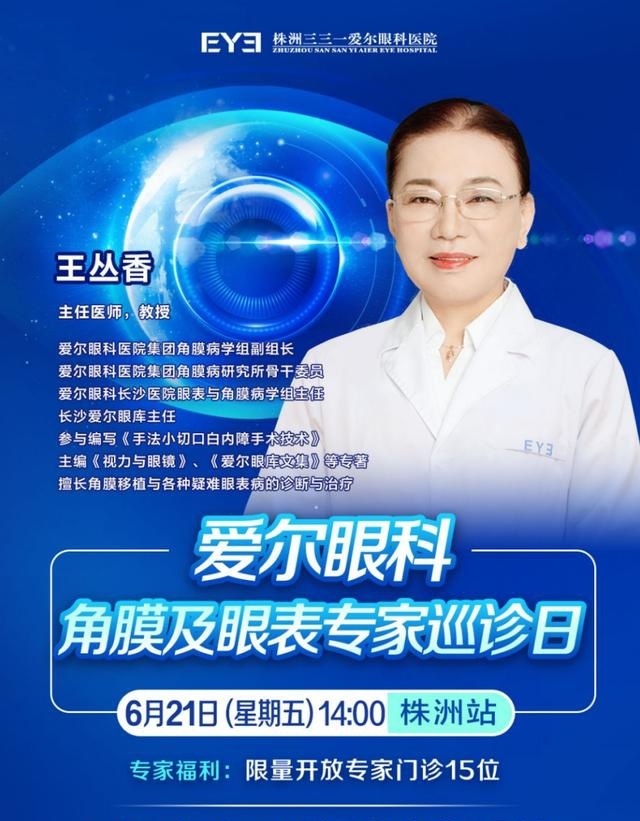 角膜及眼表疾病专家王丛香教授将于2024年6月21日(本周五)下午2点亲临株洲三三一爱尔眼科医院,为疑难眼病患者亲诊,尤其是长期饱受中、重度干眼症及角膜疾病困扰的患者,“零距离”一对一定制诊疗方案。株洲地区的干友们不出远门就能享受到知名专家眼健康VIP诊疗服务。