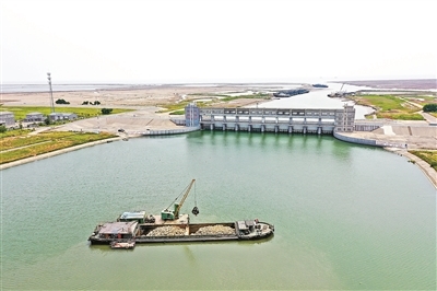 6月16日,江苏盐城,大丰区川东闸管理所组织施工单位加快实施川东港新闸上下游冲塘应急处理工程,通过铺设砂肋土工布与抛填块石相结合方式,修复上下游冲塘,保证闸站安全运行 供图/视觉中国
