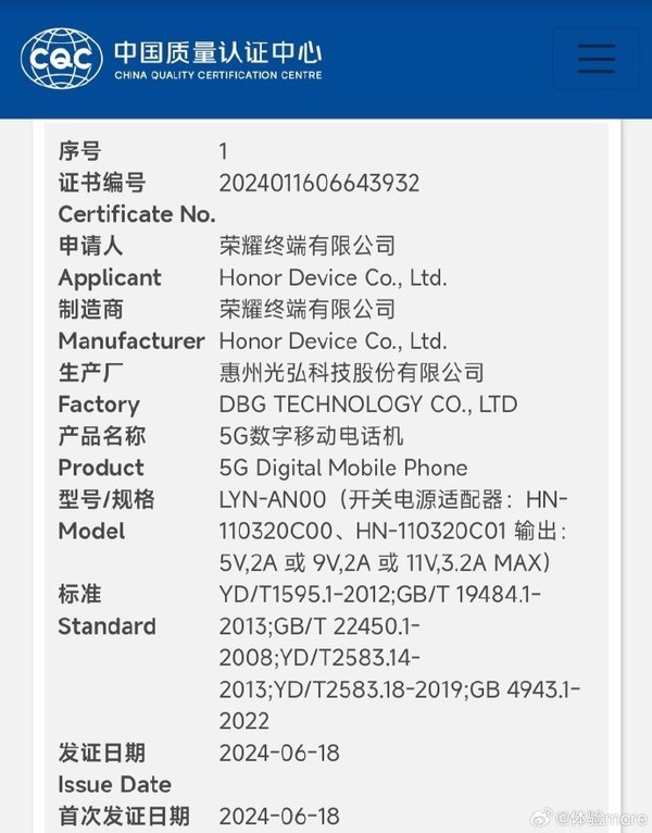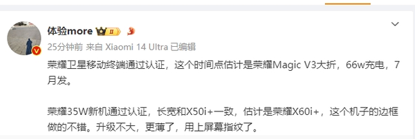 【CNMO科技消息】6月19日,CNMO注意到,荣耀Magic V3大折叠屏通过中国质量认证中心认证,支持66W充电,预计7月正式发布。与此同时,荣耀的另一款新机型,据传为荣耀X60i+,也已通过认证,支持35W充电。博主表示,虽然升级幅度不大,但新机拥有更薄的机身设计,并引入了屏幕指纹技术。