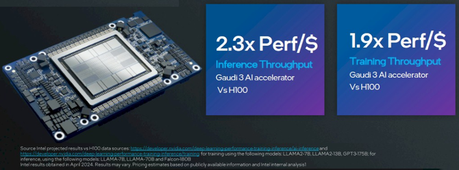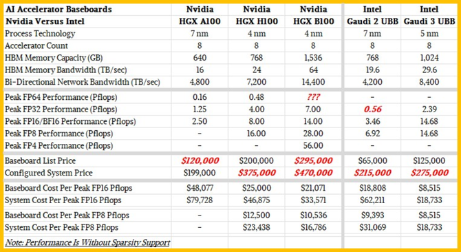 通过英特尔发布的Gaudi 2和Gaudi 3加速器的定价信息以及一些基准测试结果,包括采用这些芯片的服务器峰值馈入和速度,分析机构可以深入剖析并对芯片厂商之间的市场竞争进行比较。