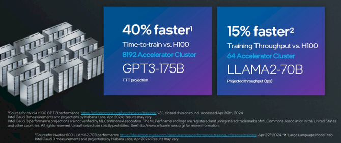 如果用户构建一个系统,并添加那些成本昂贵的CPU、主内存、网络接口卡和本地存储设备,那么成本的差异就会逐渐缩小。如上所述,配置英伟达H100系统的成本可能在375,000美元左右,即每千万亿次浮点运算46,875美元。同样配置的Gaudi 3系统的运行成本约为27.5万美元,每千万亿次浮点运算的成本为18733美元。英特尔在此方面展现了2.5倍的性价比优势。