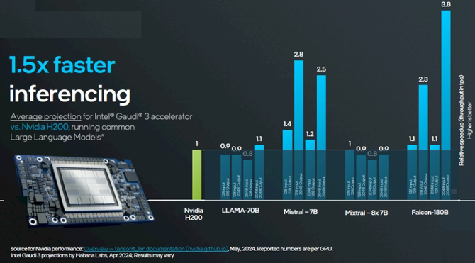 在训练环节,英特尔的比较采用了Llama 2 7B、Llama 2 13B和GPT-3 175B的真实英伟达数据平均值,与Gaudi 3的估算值进行了对比。为了进行推断,英特尔则结合了Llama 2 7B、Llama 2 70B和Falcon 180B的真实英伟达数据平均值,与Gaudi 3的估计数据进行了对比。