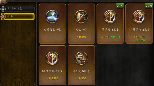 这两个功能外服是在去年开放的。首先是在2023年的2月8日,也就是国服关服没多久,WLK怀旧服就推出了转阵营的服务。收费价格如下,阵营转换组合包选项有: