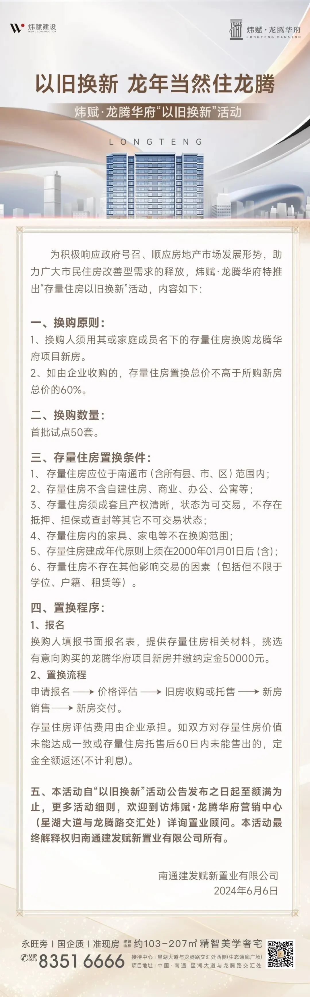 不过需要提醒的是,炜赋·龙腾华府“存量住房以旧换新”活动首批试点仅限50套,有换房需求的各位需抓紧机会!