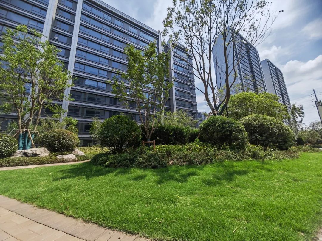 这种对颜值和品质的追求,延续到了景观设计中。走在园区放眼望去郁郁葱葱,阳光草坪与乔木、灌木很好地融合在一起,高低错落富有层次感。