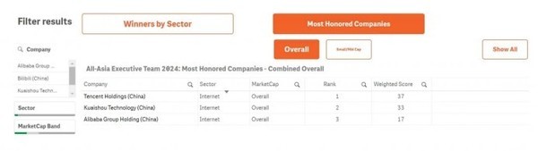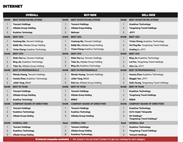 据悉,此次评选的参与机构管理的亚洲股票总市值超过2万亿美元,反映了资本市场对腾讯、阿里巴巴、快手等国内互联网巨头在治理、战略执行、财务透明度、投资者关系及ESG实践等方面的高度认可。其排名结果也成为全球投资风向标,受到买方投资者及卖方机构的认可。