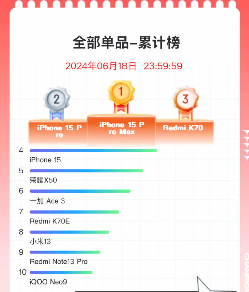 同时,618大促中单品累计前十的机型分别为苹果iPhone 15 Pro Max、苹果iPhone 15 Pro、Redmi K70、苹果iPhone 15、荣耀X50、一加Ace 3、Redmi K70E、小米13、Redmi Note 13 Pro和iQOO Neo 9。其中,苹果有三款机型,小米有四款机型,荣耀、一加和iQOO各有一款机型现身。