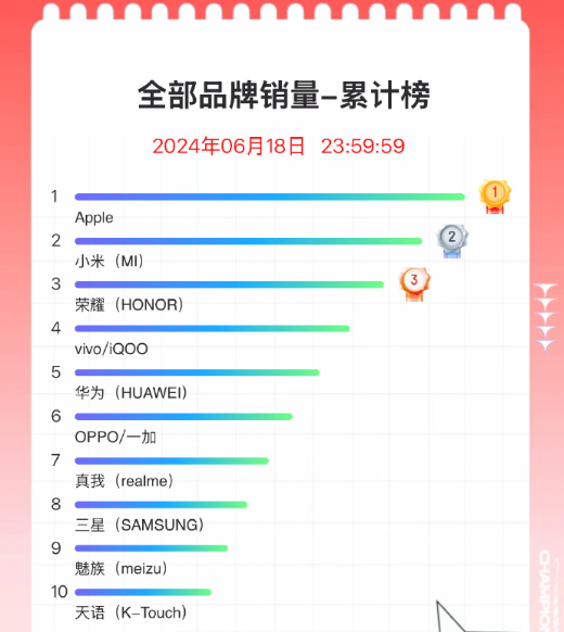 CNMO则注意到,根据京东自营平台的《手机竞速排行榜》,此次618大促中销售额排名前十的品牌分别为:苹果、小米、华为、vivo+iQOO、荣耀、OPPO+一加、三星、真我、魅族和努比亚。手机销量排名前十的品牌分别为苹果、小米、荣耀、vivo+iQOO、华为、OPPO+一加、真我、三星、魅族和天语。