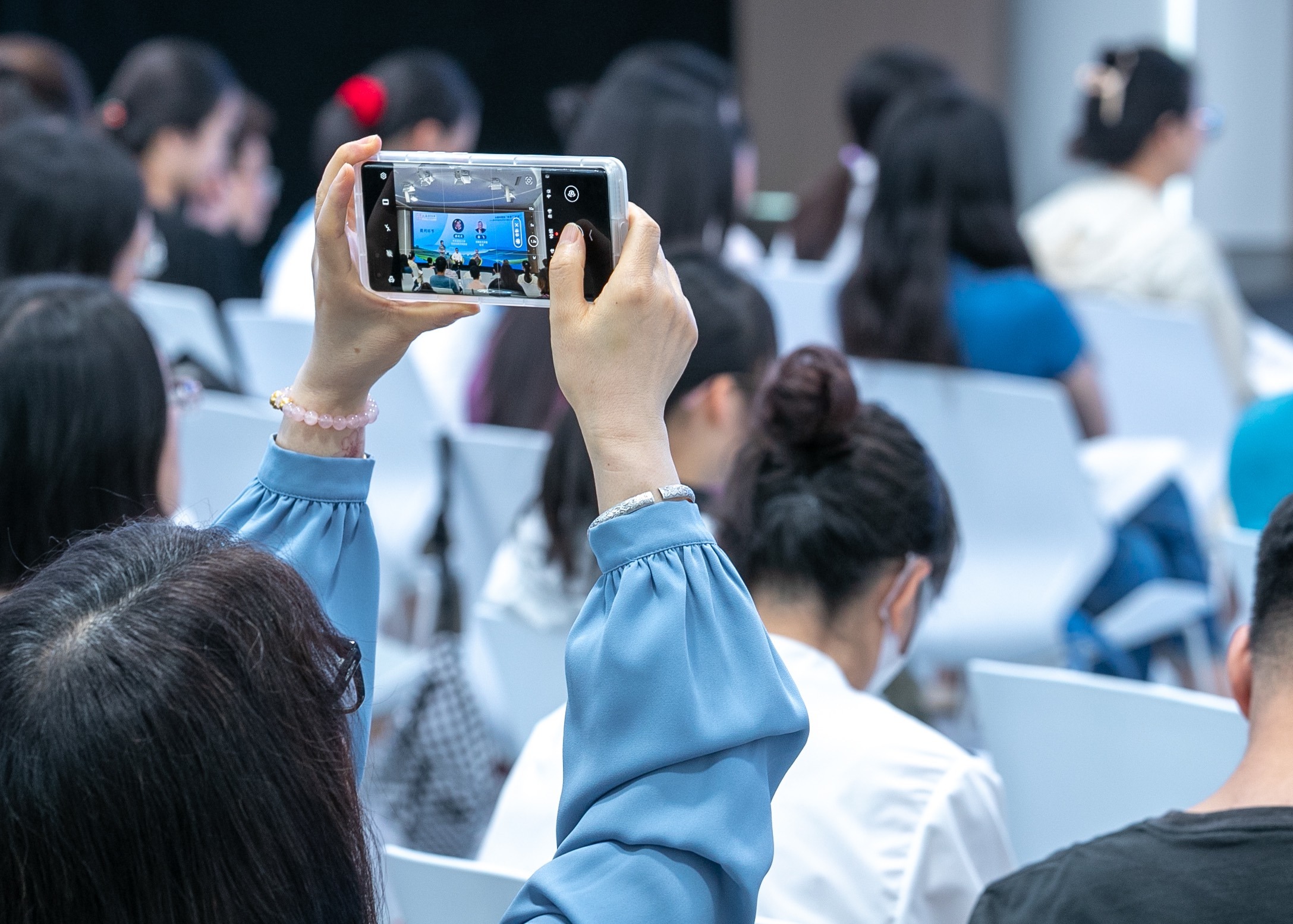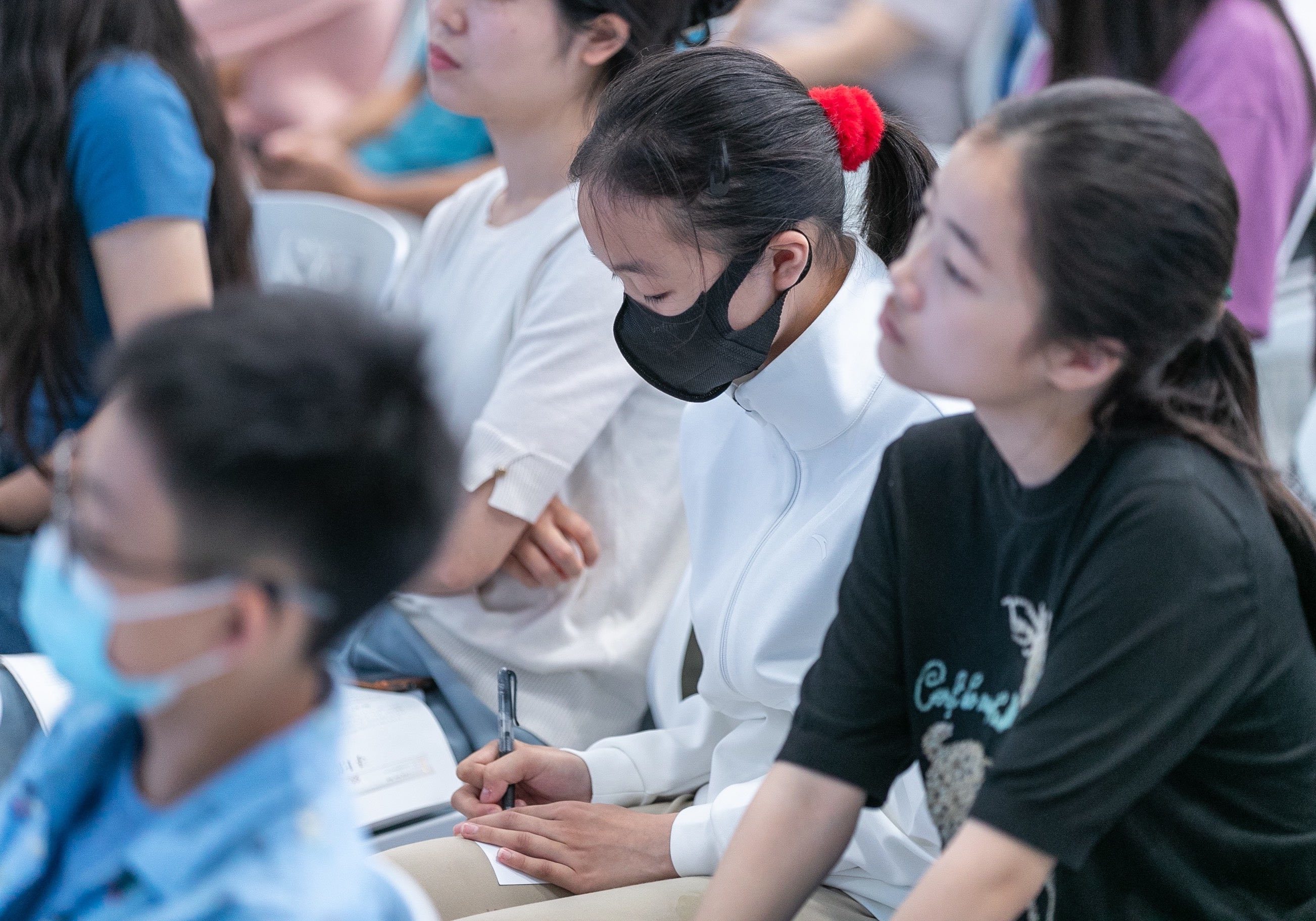 8鞍山实验中学同学杨安琪(中间)在讲座中对陶豆这一器型进行了思考并提问