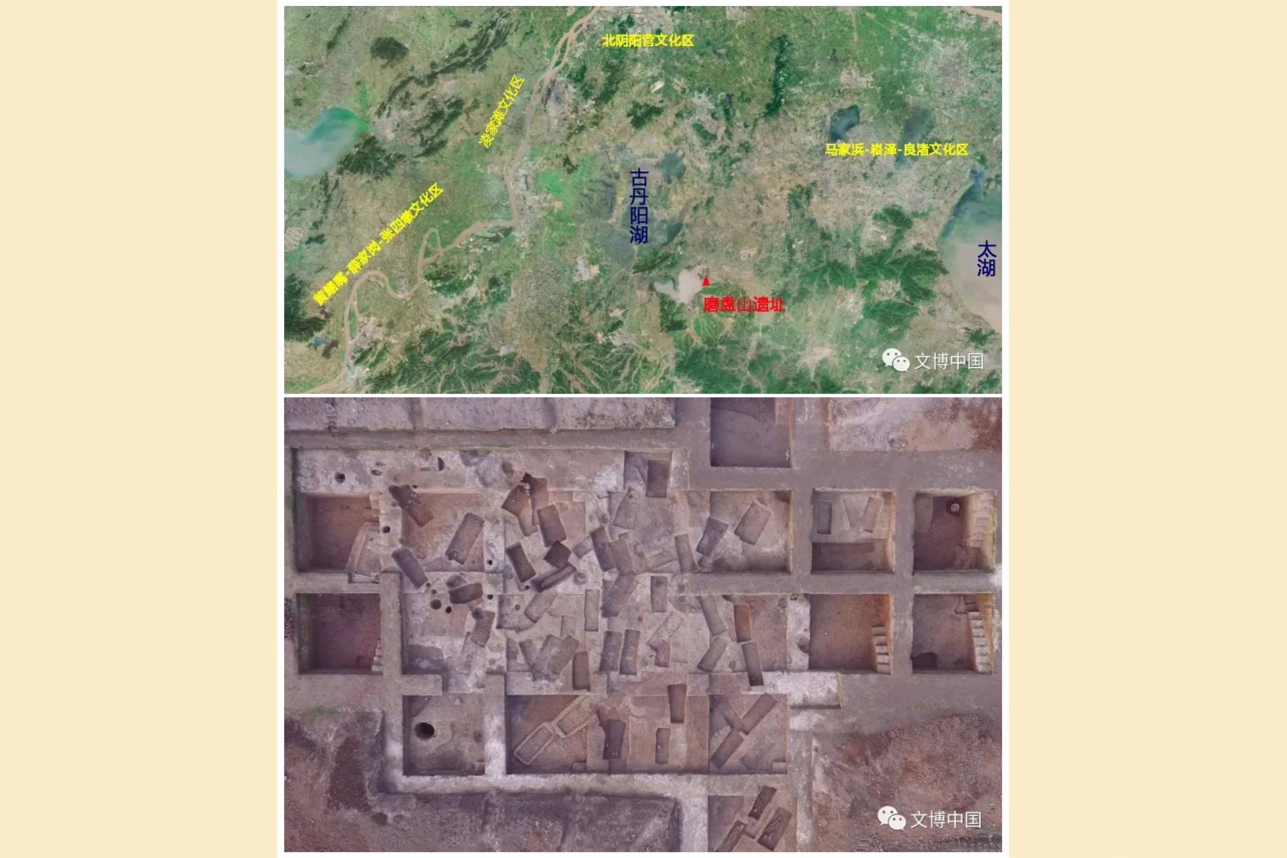 上为磨盘山遗址位置及环境,下为崧泽文化时期墓葬区
