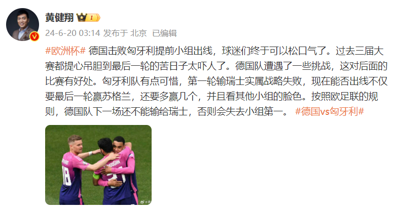 知名足球解说员黄健翔发文评论:德国击败匈牙利提前小组出线,球迷们终于可以松口气了。过去三届大赛都提心吊胆到最后一轮的苦日子太吓人了。德国队遭遇了一些挑战,这对后面的比赛有好处。匈牙利队有点可惜,第一轮输瑞士实属战略失败,现在能否出线不仅要最后一轮赢苏格兰,还要多赢几个,并且看其他小组的脸色。按照欧足联的规则,德国队下一场还不能输给瑞士,否则会失去小组第一。