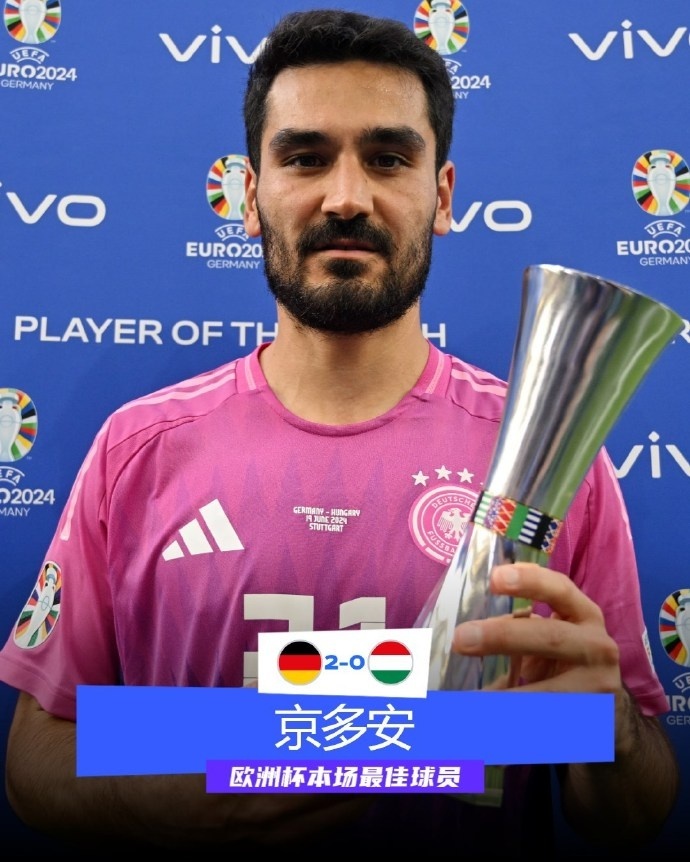 京多安当选本场比赛最佳球员!2012年京多安第一次登上欧洲杯的舞台,时隔12年,他终于收获了职业生涯的欧洲杯首球。