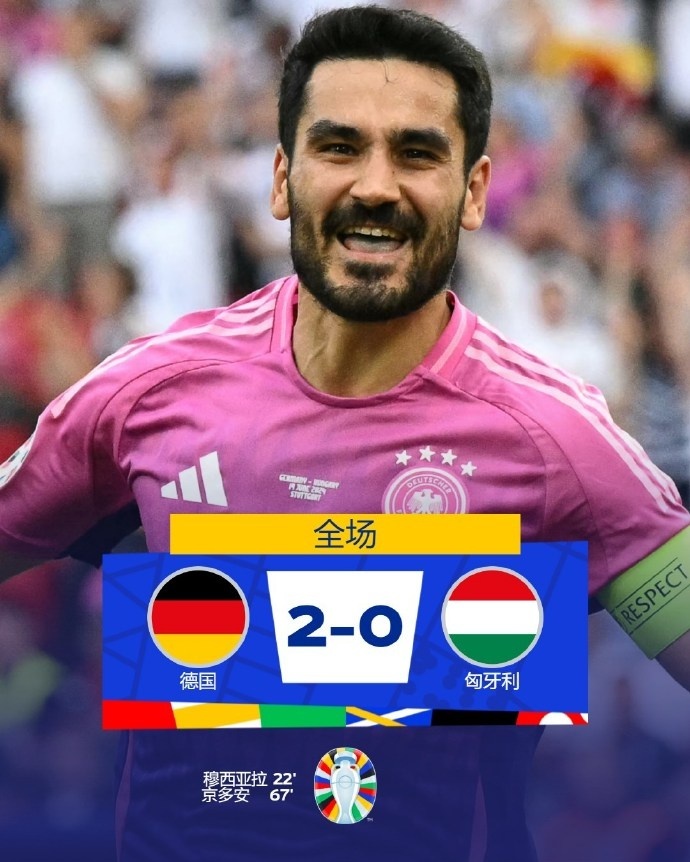 上半场,京多安助攻穆西亚拉首开纪录,索博斯洛伊任意球造险,绍洛伊头球破门被吹,半场德国队1比0领先匈牙利。易边再战,米特尔施塔特送出助攻,京多安破门完成传射建功。最终全场比赛结束,德国队2比0击败匈牙利,成为本届欧洲杯首支小组出线球队。