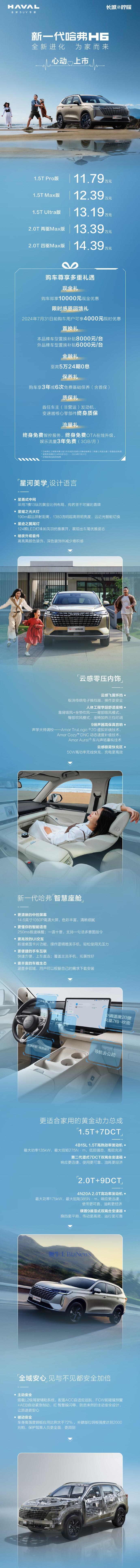 鞭牛士 6月20日消息,新一代哈弗 H6 现正式上市,共推出5款车型,价格区间为11.79 万-14.39万元,官方表示“即刻下订享10000元现金优惠,7月31日前购可再享4000元优惠”。