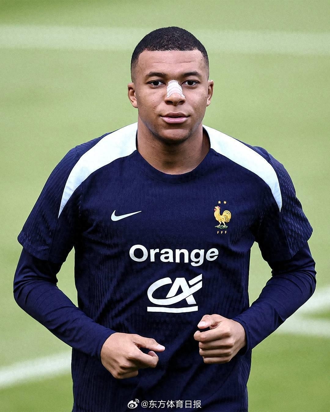 6月20日,据东方体育日报消息,为了保证法国队的欧洲杯成绩,法国教练组做出决定:让姆巴佩推迟手术,并佩戴特制的面具踢接下来的比赛。昨日训练,鼻子骨折的姆巴佩来到训练场进行恢复,先是慢跑了一会,随后参与了射门训练,他还没有佩戴面具,只是在鼻梁处粘贴了固定绷带。