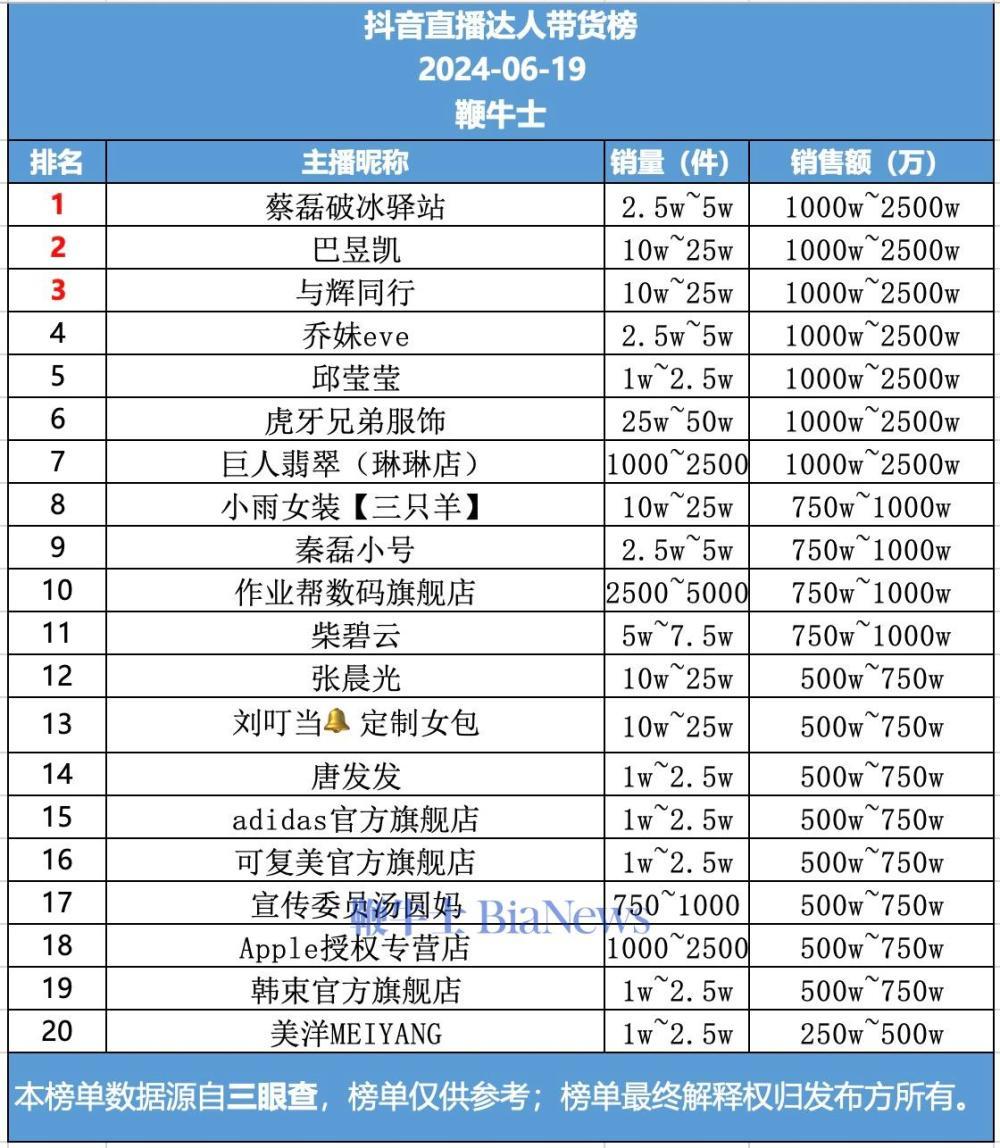 以下为6月19日抖音平台达人带货情况排名: