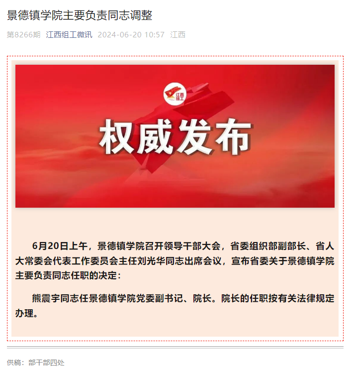 熊震宇同志任景德镇学院党委副书记、院长。院长的任职按有关法律规定办理。