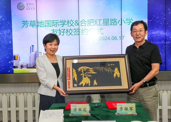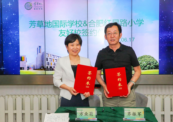 在芳草课程的勃勃生机中,在两校教育同仁的共同见证下,双方校领导方业菊校长和齐振军校长共同签订友好合作学校协议书。协议书的成功签订,标志着一段深度合作关系的开始,代表着合肥市红星路小学将携手北京市芳草地国际学校,围绕“国际化办学”在教育教学、课程建设等方面进行深度交流,互鉴共享,注入新动力,开创新局面,迈向新台阶。