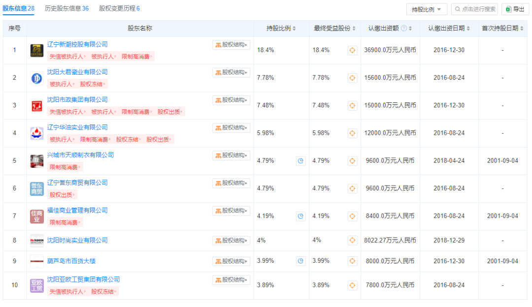 其中,第一大股东辽宁新潮控股有限公司被强制执行2.14亿元,沈阳大君瓷业有限公司、沈阳亚欧工贸集团有限公司两大股东,更是在2015年就被列入失信被执行人名单。