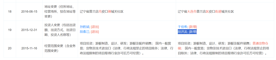 天眼查显示,中盈控股成立于2013年1月,注册地为辽宁大连,主业显示是铁路、船舶、航空航天和其他运输设备制造。一年后的4月发生投资人变更,名为“段春江”的人加入。到了2015年12月底的投资人变更显示,段春江退出,段洪涛进入。