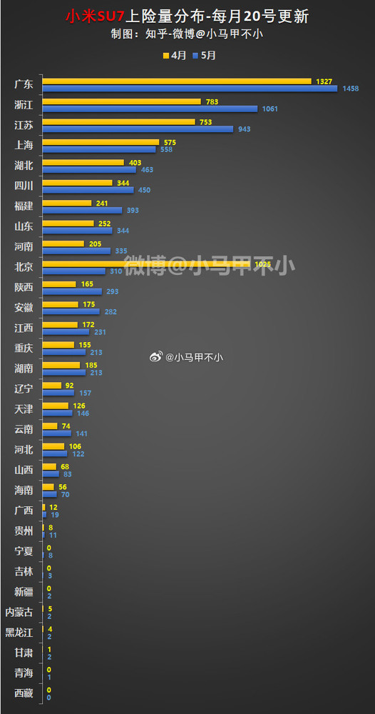 目前,小米的汽车工厂和小米总部都设在北京,按理来说在北京地区的影响力应该会更大。而数据显示,4月小米汽车在北京交付了1025辆,5月则只有310辆,下跌超过700辆。同时,广东地区4月交付量1327辆,5月交付量增长至1458辆;浙江地区4月交付量783辆,5月交付量增长至1061辆;江苏地区4月交付量753辆,5月增长至943辆;上海地区4月交付量575辆,5月下降至558辆;湖北地区4月交付量403辆,5月增长至463辆;四川地区4月交付量344辆,5月增长至450辆;福建地区4月交付量241辆,5月增长至393辆;山东地区4月交付量252辆,5月增长至344辆;河南地区4月交付量205辆,5月增长至335辆。