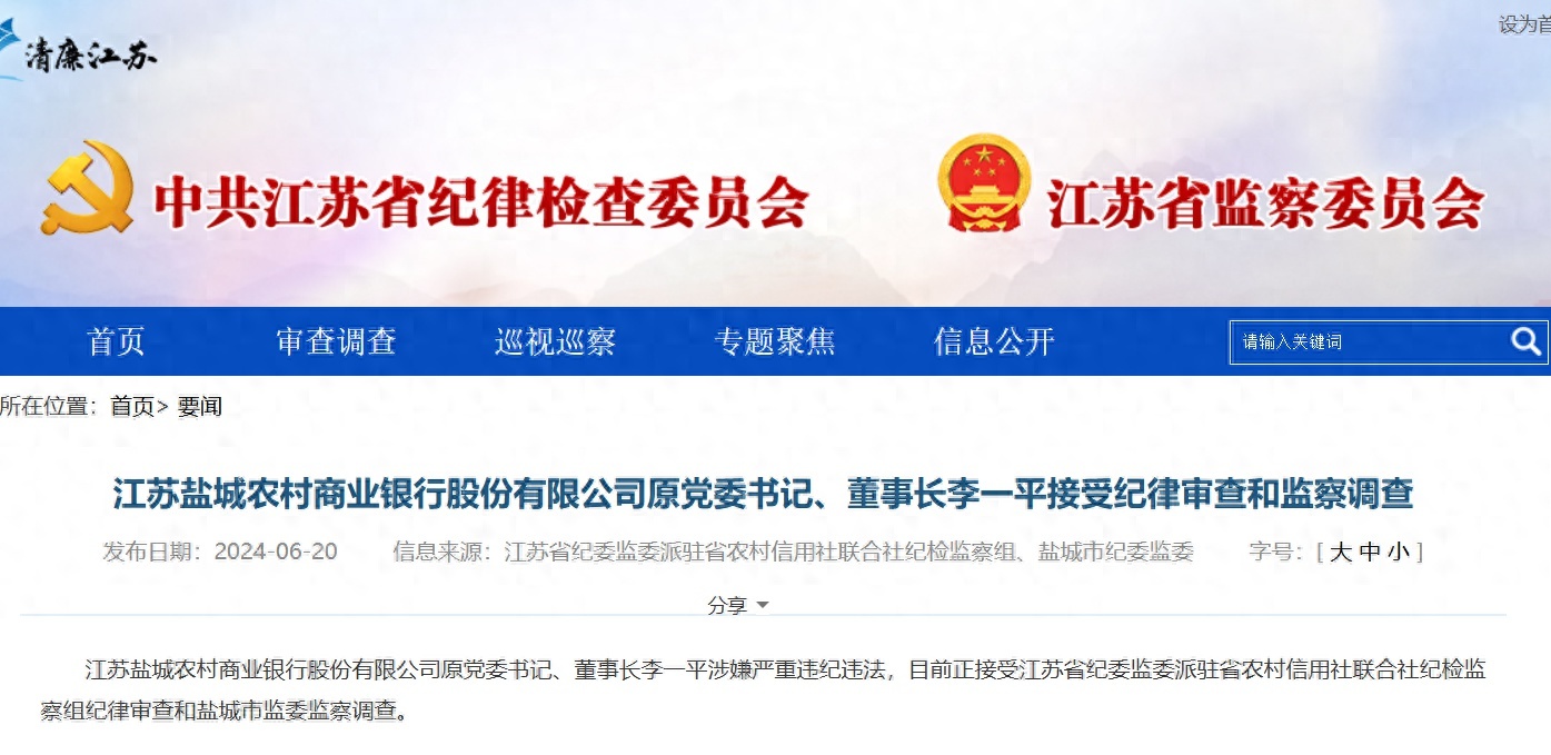 6月20日,据江苏省纪委监委网站消息,江苏盐城农村商业银行股份有限公司原党委书记、董事长李一平涉嫌严重违纪违法,目前正接受江苏省纪委监委派驻省农村信用社联合社纪检监察组纪律审查和盐城市监委监察调查。
