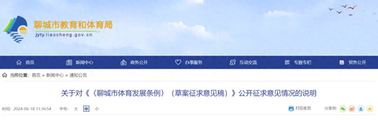2024年5月8日,我局在官方网站上发布了关于对《〈聊城市体育发展条例〉(草案征求意见稿)》公开征求意见的通知,向社会公开征求意见。公告期自2024年5月8日起至2024年6月9日止。