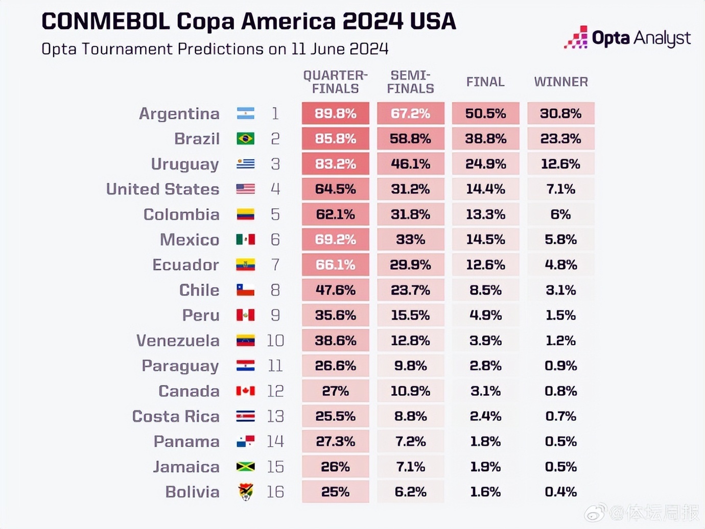 根据Opta超级计算机的模拟,阿根廷的夺冠概率高达 30.8%,进入决赛的几率高达 50.5%;巴西以23.3% 的夺冠概率紧随其后。