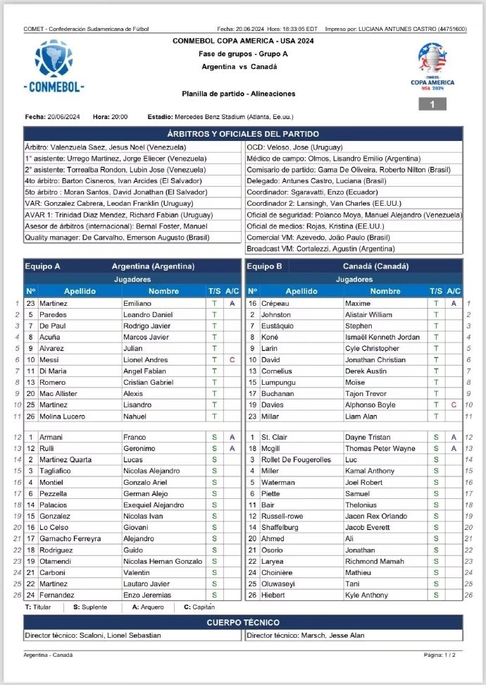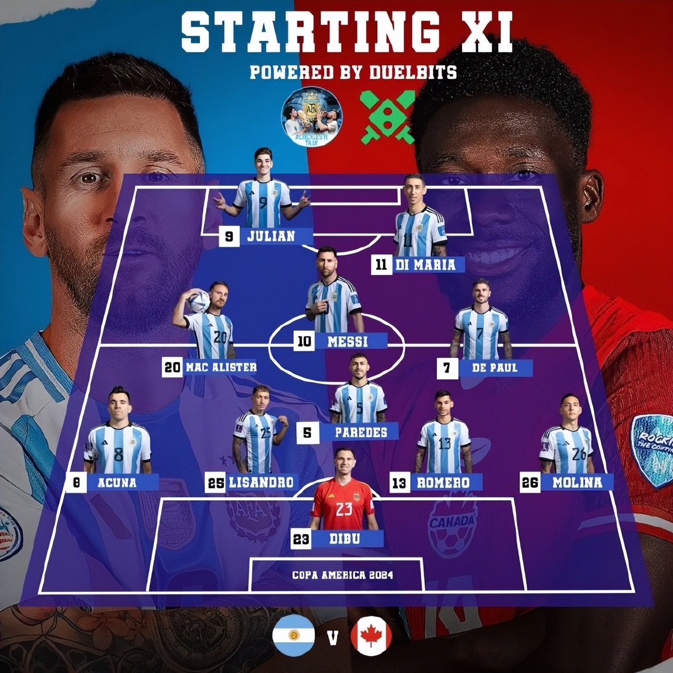 阿根廷首发:23-马丁内斯、26-莫利纳、13-罗梅罗、25-利桑德罗、8-阿库尼亚、5-帕雷德斯、7-德保罗、20-麦卡利斯特、10-梅西、11-迪马利亚、9-阿尔瓦雷斯