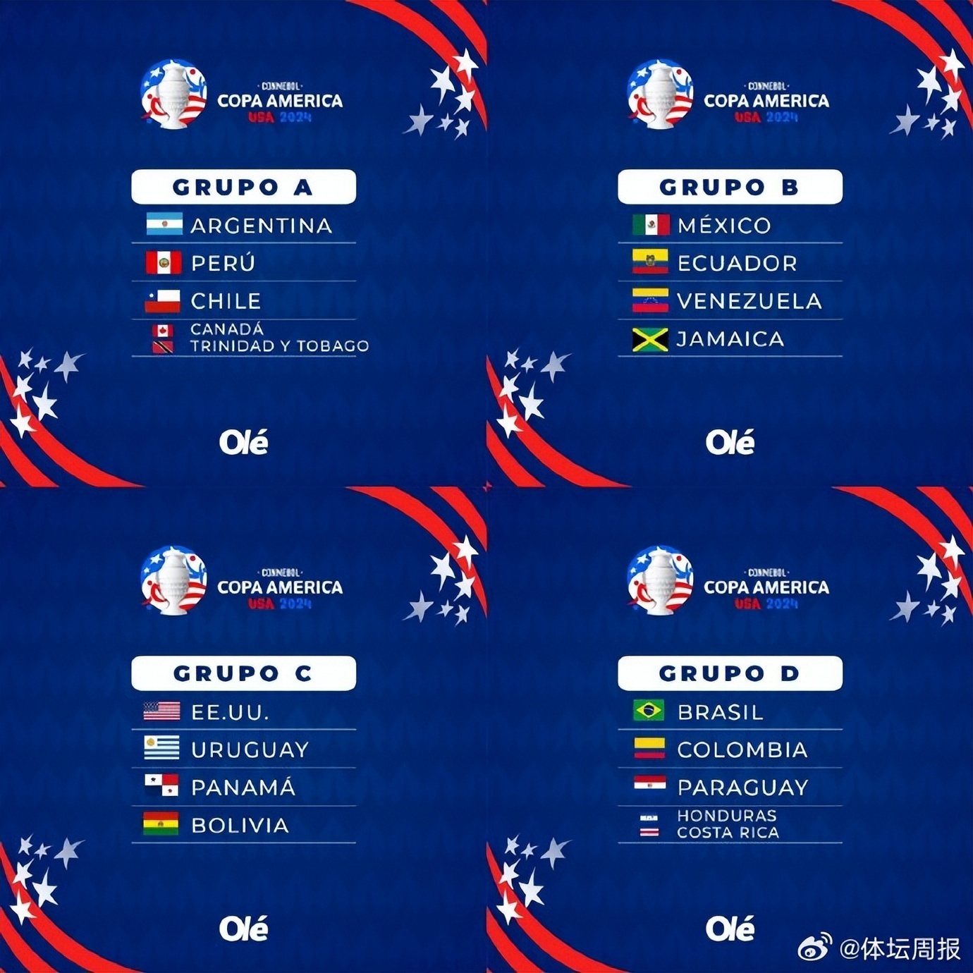 本届美洲杯,卫冕冠军阿根廷与秘鲁,智利,加拿大同居A组。东道主美国队身居C组,将与乌拉圭,巴拿马,玻利维亚在小组赛交手。第二大夺冠热门巴西队身居D组。