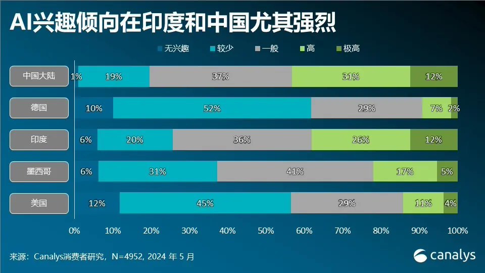 报告还提到,中国大陆是全球前三大智能手机市场中 AI 兴趣倾向最强的市场,中国大陆消费者在调查中展现出了对新技术更开放的态度。