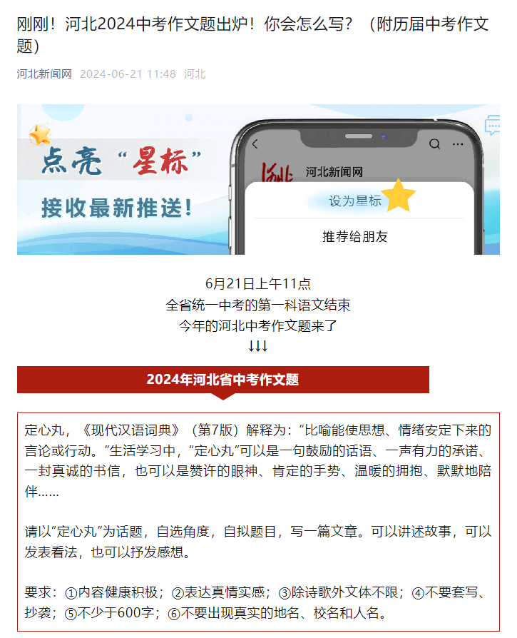 据河北新闻网消息:6月21日上午11点,全省统一中考的第一科语文结束,今年的河北中考作文题来了!