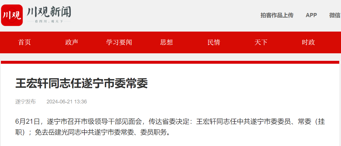 据川观新闻:6月21日,遂宁市召开市级领导干部见面会,传达省委决定:王宏轩同志任中共遂宁市委委员、常委(挂职);免去岳建光同志中共遂宁市委常委、委员职务。