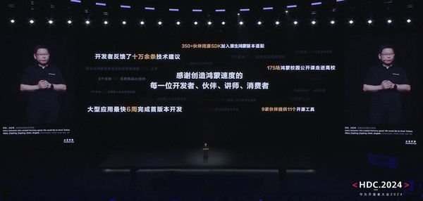 余承东在大会上感谢了合作伙伴,感谢开发者、伙伴们一起拥抱鸿蒙生态。余承东特别提到,尤其是美团,真正展现了鸿蒙速度。美团是首批加入鸿蒙生态的伙伴,同时也是鸿蒙生态开发多模块协作设计的先行者。美团仅仅用了6周的时间,就完成了首个鸿蒙星河版核心功能,并成功地点出了第一份“鸿蒙外卖”。