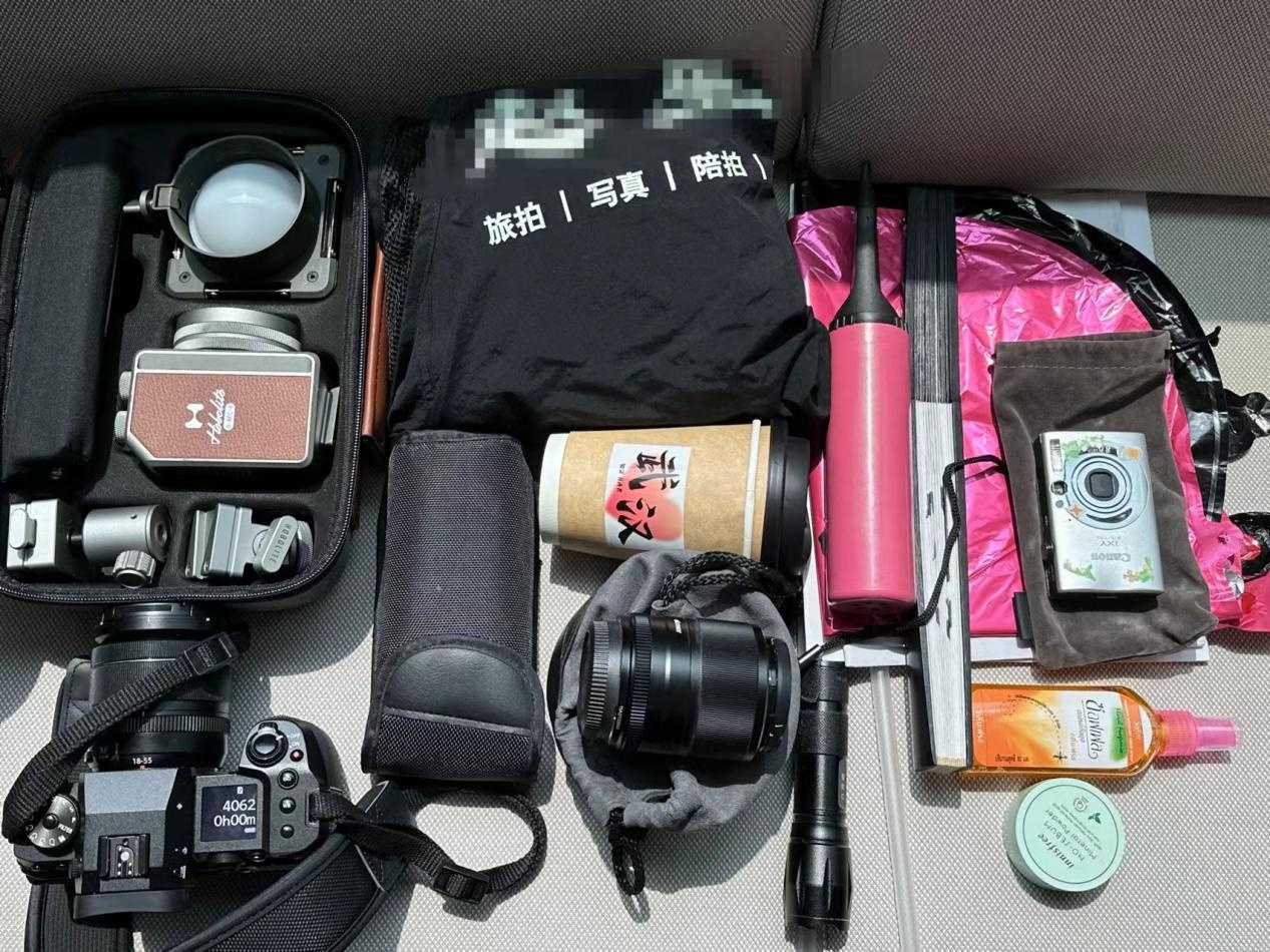 拍摄中需要随身携带的物品,包括带有武汉字样的气球和杯子,ccd,闪光灯,补妆用品,驱蚊水等。图/星辰