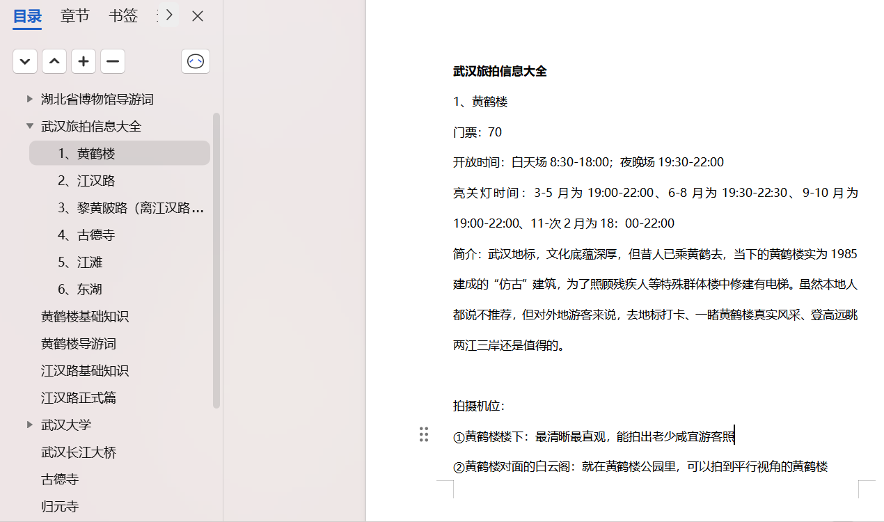 在陪拍过程中,星辰不仅为游客提供了拍照服务,还通过讲解让游客对武汉有了更深入的了解。为此,她特意整理了近三万字的武汉景点文稿,其中包括了详细的拍摄地点、时间和机位信息,以及湖北省博物馆、黄鹤楼、江汉路等地的导游词。在拍摄过程中,她会根据游客的兴趣和需求进行个性化的讲解,让他们在欣赏美景的同时,也能感受到武汉的历史底蕴和文化魅力。