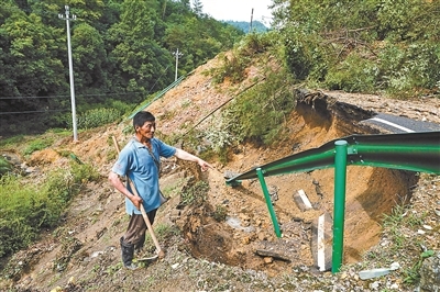 6月21日,在歙县桂林镇008县道一处塌方点,当地村民陈海生查看损毁路段