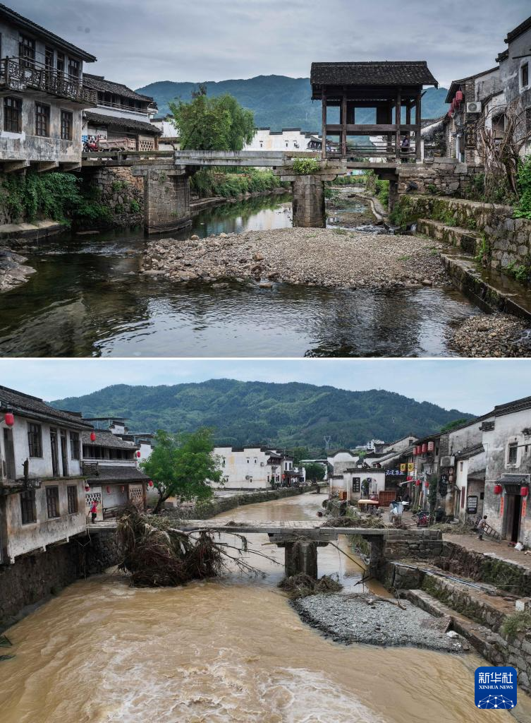 拼版照片:上图为呈坎村环秀桥资料照片(方君尧 摄),下图为6月21日拍摄的呈坎村环秀桥现状(无人机照片,郑辰摄)。