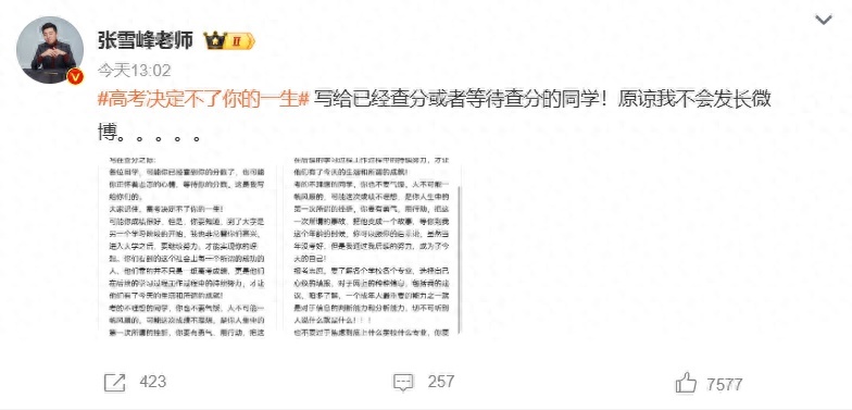6月23日,教育博主张雪峰发长文叮嘱高考查分同学,表示高考决定不了你的一生。