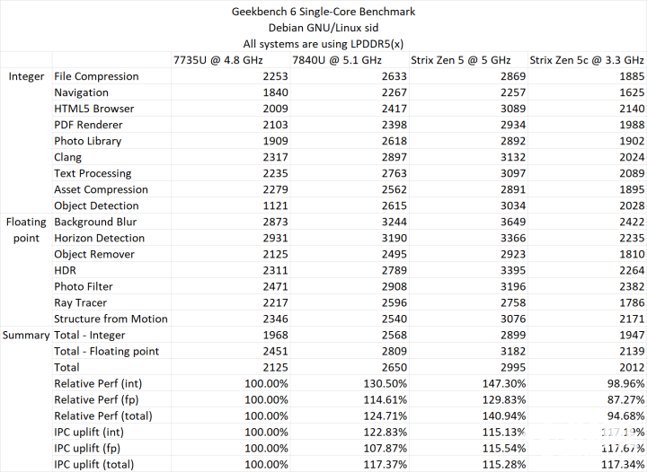 AMD在移动处理器连续四代提供8核心产品、连续三代使用原生8核心的CCX之后,终于迎来了大幅度修改,Strix Point属于原生12核心,由非对称的两个CCX组成: CCX0为4个Zen 5内核,搭配16MB的L3缓存,相比桌面处理器的缓存设计做了精简;CCX1为6/8个Zen 5c内核,搭配8MB的L3缓存,与Zen 5完全相同的微架构,属于低功耗精简版。其中Zen 5内核的最高加速频率为5.0 GHz,而Zen 5c内核实测的频率为3.3 GHz。
