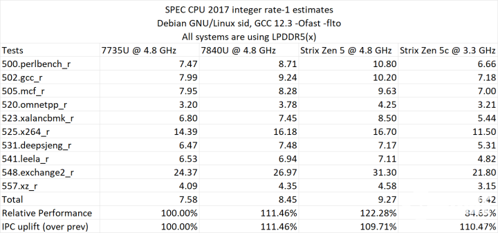 在SPEC CPU 2017 rate-1测试里,由于部分子项目会遭遇温度墙问题,所以将频率设置了4.8 GHz。显示与前一代基于Zen 4架构内核的处理器相比,Zen 5架构内核的整数IPC提升幅度为9.71%。而在Geekbench 5/6测试里,Zen 5架构的单核IPC性能幅度分别为15.28%和17.66%,与AMD官方宣传的16%差不多。