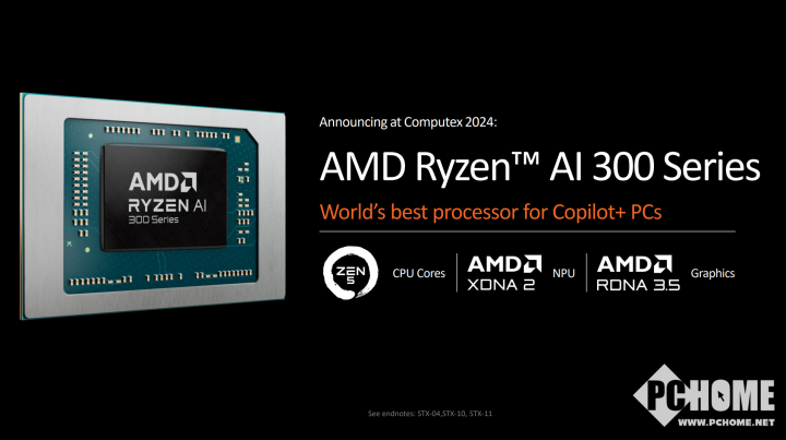 Ryzen AI 9 365采用了混合架构设计,CPU部分包括了Zen 5和Zen 5c架构的内核,为Zen 5 x4+Zen 5c x6的组合,共10核心20线程,L2+L3缓存共有34MB;GPU部分为RDNA 3.5架构,最多配备16个CU;另外还有新的XDNA 2神经处理单元(NPU),提供50 TOPS的性能,轻松超过了微软Windows对于下一代AI PC的40 TOPS要求,可以在本地运行Copilot这类AI工作负载。