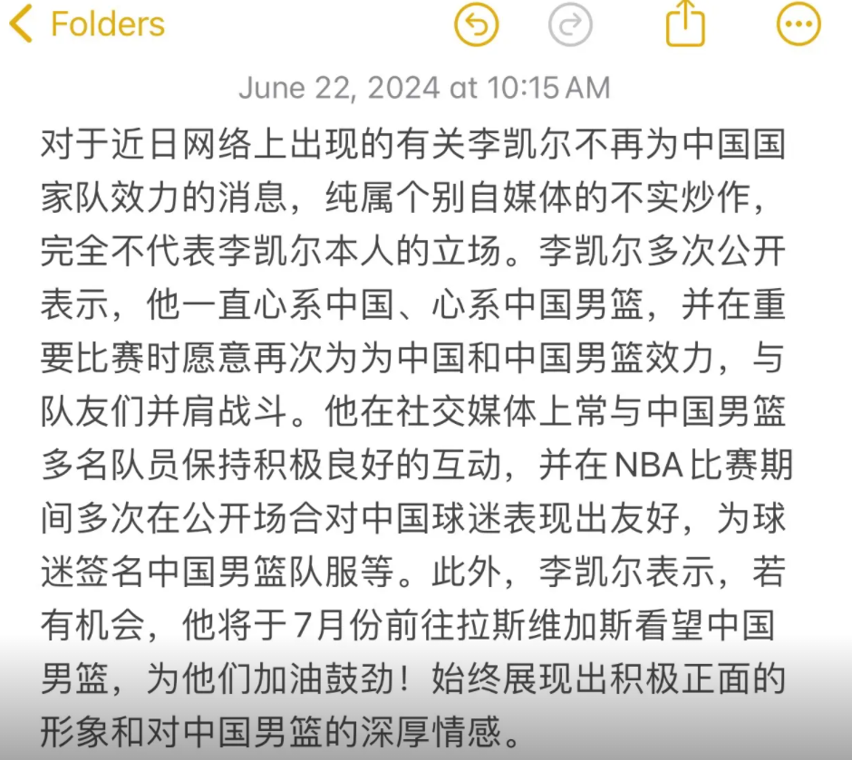 其经纪人称:“对于近日网络上出现的有关李凯尔不再为中国国家队效力的消息,纯属个别自媒体的不实炒作完全不代表李凯尔本人的立场。李凯尔多次公开表示,他一直心系中国、心系中国男篮,并在重要比赛时愿意再次为为中国和中国男篮效力,与队友们并肩战斗。他在社交媒体上常与中国男篮多名队员保持积极良好的互动,并在NBA比赛期间多次在公开场合对中国球迷表现出友好,为球迷签名中国男篮队服等。此外,李凯尔表示,若有机会,他将于7月份前往拉斯维加斯看望中国男篮,为他们加油鼓劲!始终展现出积极正面的形象和对中国男篮的深厚情感。”