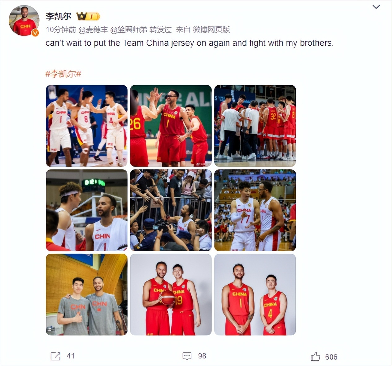“我迫不及待地想再次穿上中国队的球衣,和我的兄弟们一起战斗。”李凯尔在社交媒体上写道,并晒出多张身穿中国男篮球衣照。