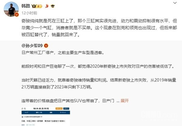 对此,资深车评人韩路表示:日产奇骏纯纯就是死在三缸发动机上了,那个三缸发动机其实很先进,动力和震动抑制很有水平,但毕竟少一个气缸,消费者就是不买单。他还称,这个现象在别克和领克两个品牌上也出现过,但后来都被四缸发动机替代了,销量就回来了。