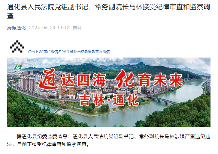 据通化县纪委监委消息:通化县人民法院党组副书记、常务副院长马林涉嫌严重违纪违法,目前正接受纪律审查和监察调查。